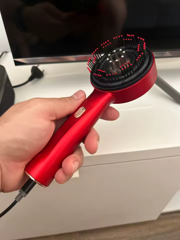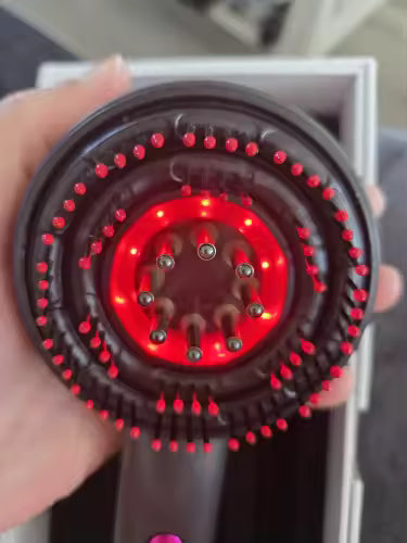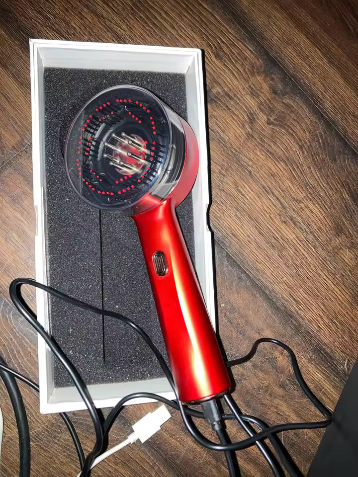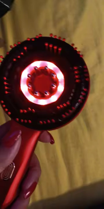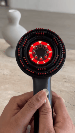 A multi-functional scalp massage brush with vibration and red light therapy to relax the scalp, improve circulation, and support healthier-looking hair while evenly distributing oils and treatments.